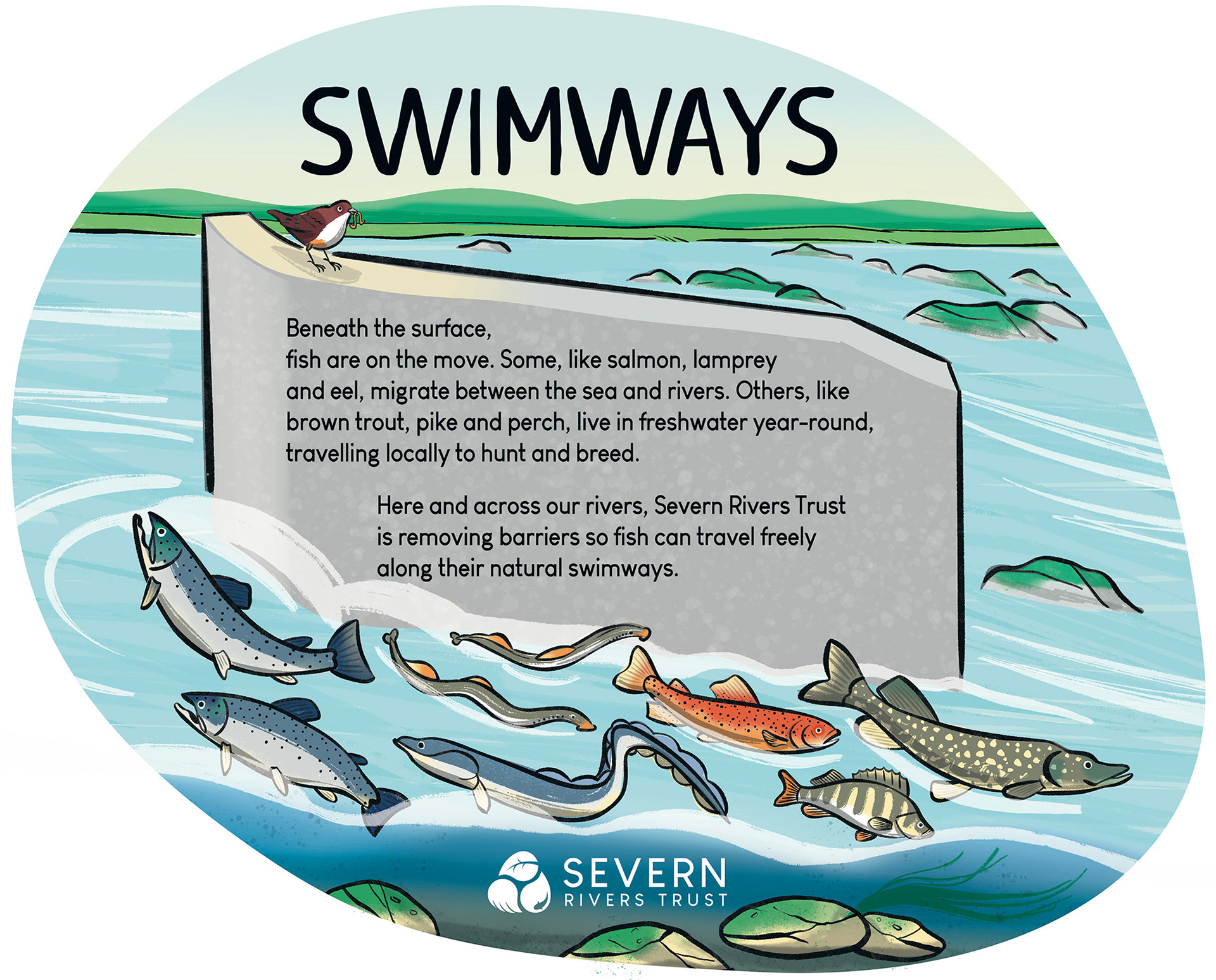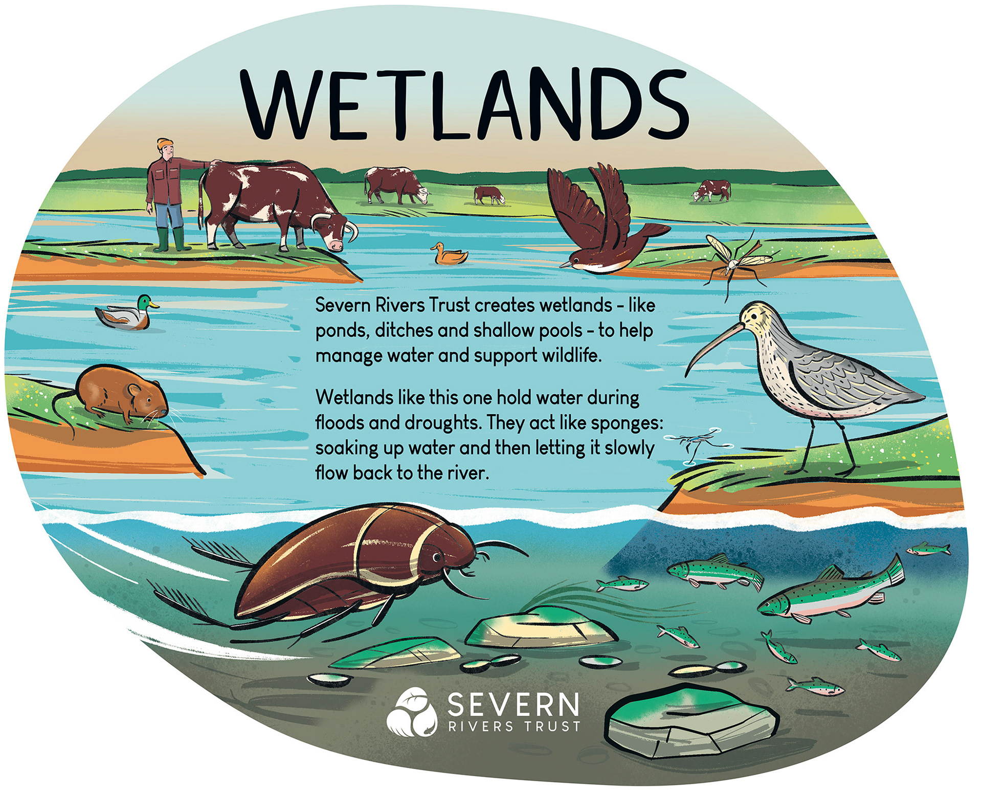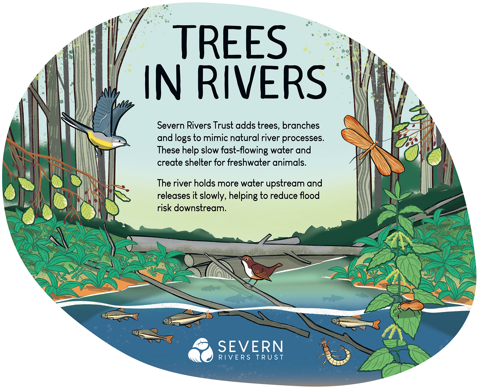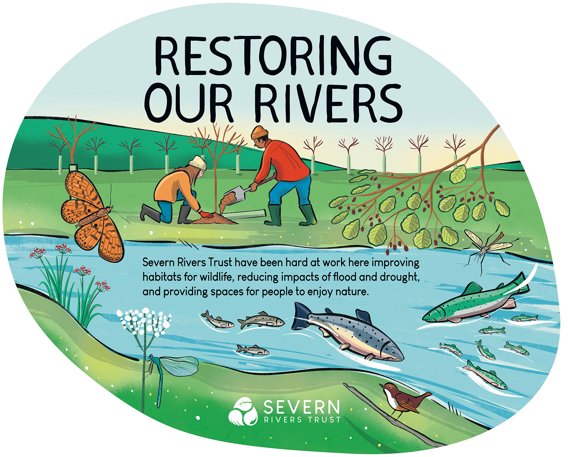 Illustrations for Severn Rivers Trust, designed for a new signage scheme to engage and inform the public about the Trust’s conservation work. 2025.